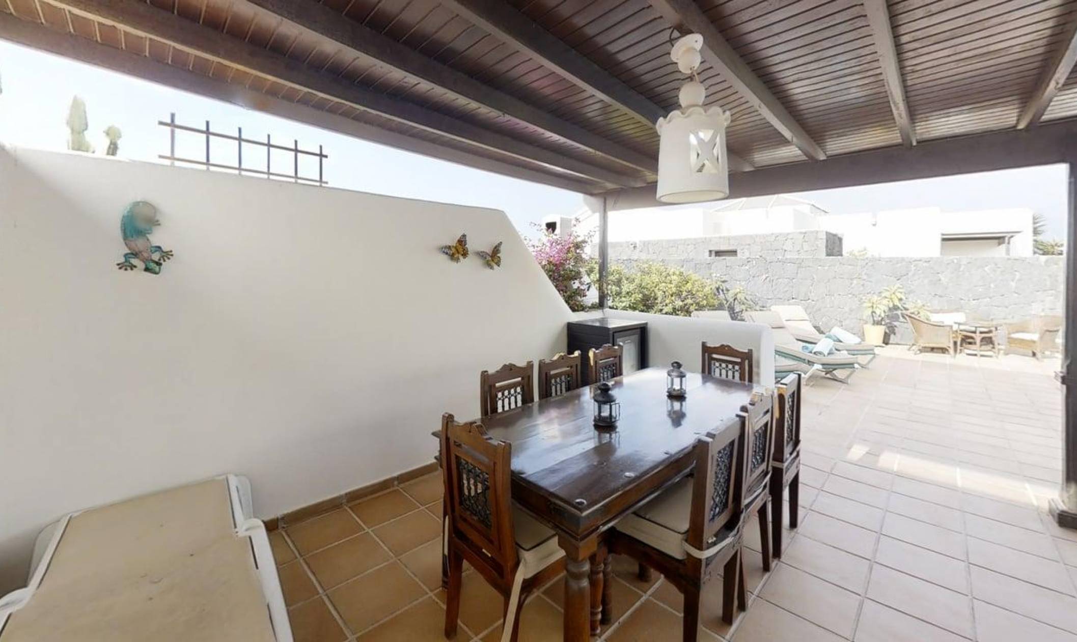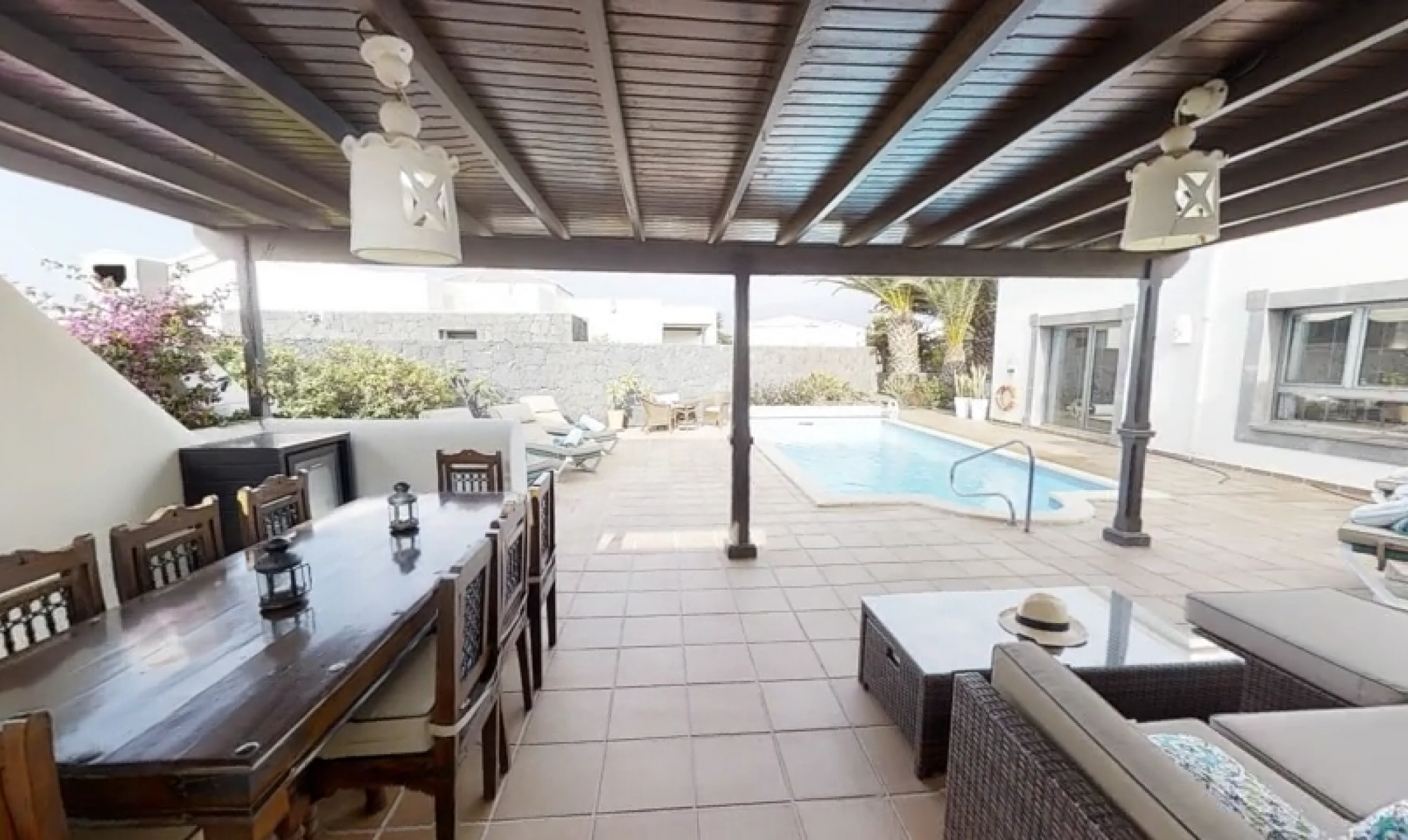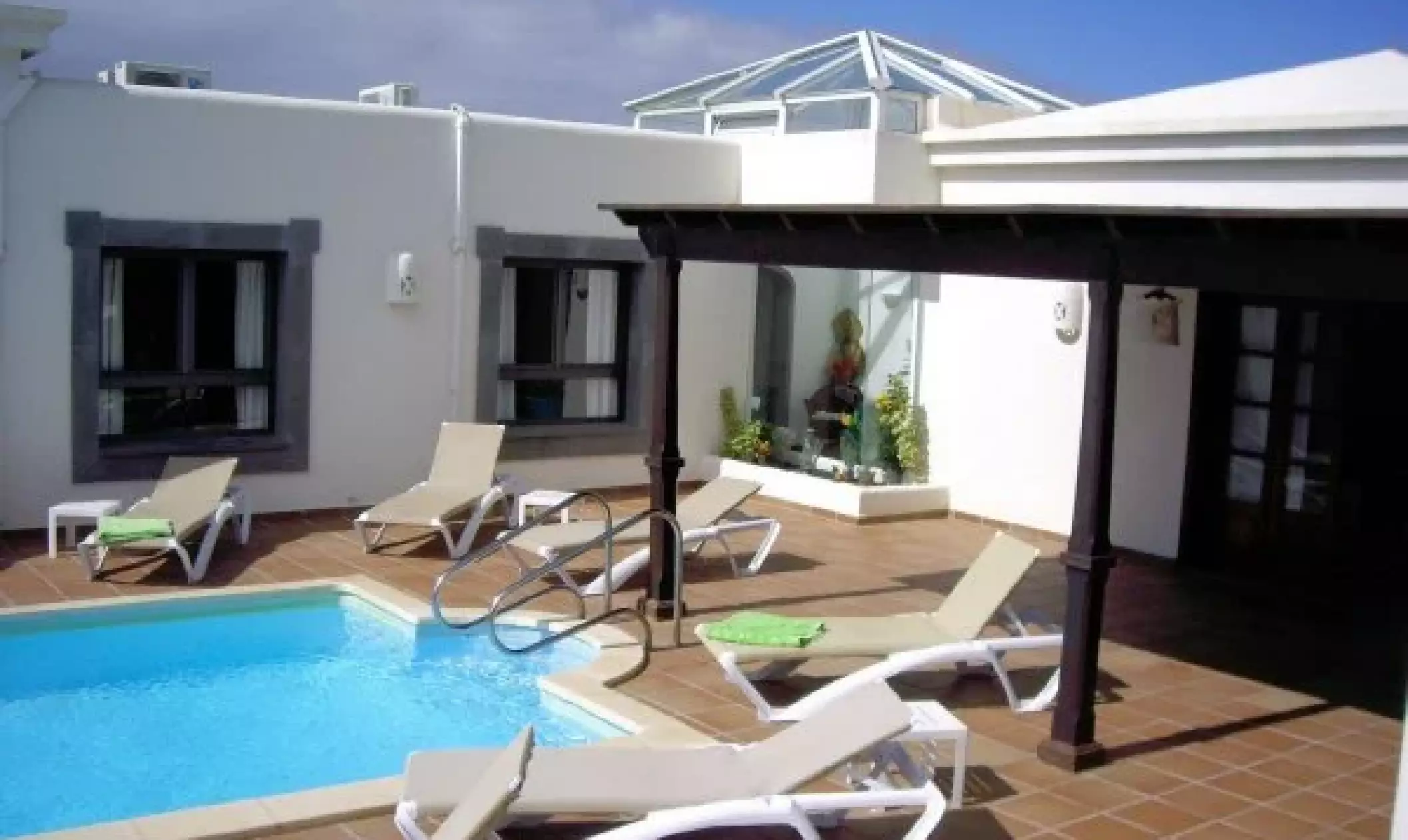 Carlara is superb 5 Star modern villa, you will be 250m from the amazing Sea front promenade walk to Playa Blanca, along the Atlantic sea's edge, where there are 2 lighthouses and Fuerteventura & Los Lobos views. This is a single storey, L shaped villa, with 3 air conditioned bedrooms, all over looking the private pool, not overlooked. The electric heated swimming pool faces south, so it receives lots of the wonderful sunshine, and there is also a huge shady pergola, all this in a large plot of 750 sq mtrs; complete with large outdoor dining table and dedicated barbecue area. Whilst being so close to local amenities, shops and excellent restaurants, Carlara offers unique outdoor privacy, within our mature established Canarian garden, surrounded by a volcanic rock wall. Enabling you to eat alfresco, dine out or have multiple choice take away. Has a safe and security alarm system. 2+ car park spaces and only 2mins walk to the nearest bakery, restaurants, takeaway, pubs and small supermarket with UK newspapers. Our local English agents Jo and Kevin are on hand, based in Playa Blanca are 10 minutes away, who manage the villa and the supporting services. If there are any issues, they are contactable to provide assistance and provide a great welcome pack of bread, cheese, ham and marmalade, butter, water, wine, coffee, tea, orange juice, milk & bathroom tissues. The cleaning team ensure that the villa and linen is scrupulously cleaned before your arrival, they have very high standards. The same with the pool, which is tested twice a week, balanced and cleaned. We are always replacing and upgrading things in our villa, and pay a close eye to detail as we really do want you to enjoy your holiday and tell everyone about us.