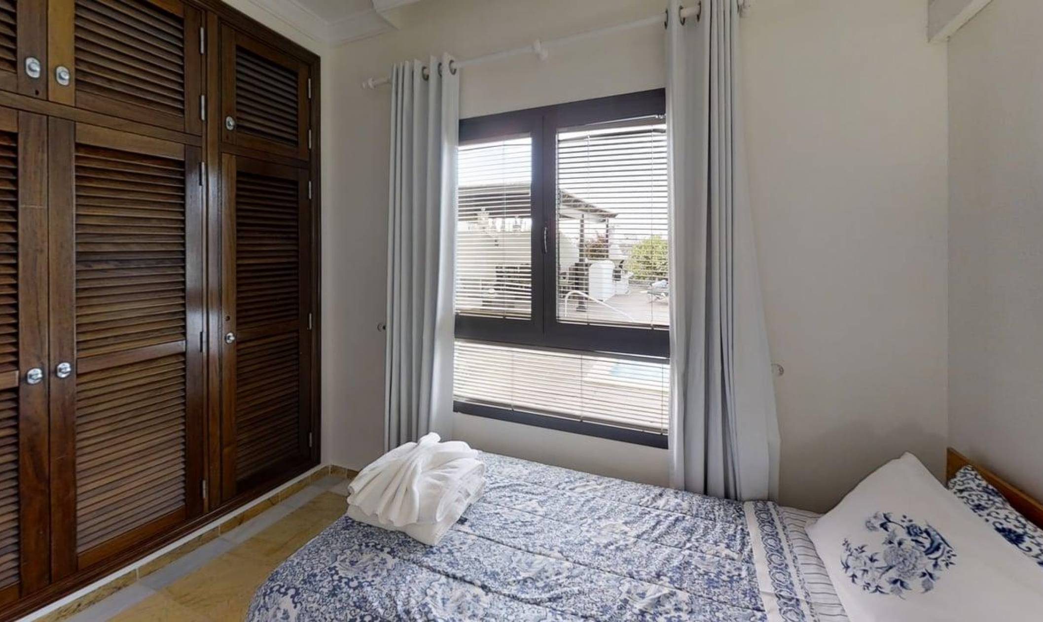 The Colonial style Master bedroom suite with Free Air-conditioning/heating, has a specialist Memory mattress, Super-Kingsize bed (6' x 6'6), along with 100% cotton Ralph Lauren designer beautiful linen and a good choice of different types of pillow, all of excellent quality. There is a spacious walkthrough changing room with plenty of solid teak wardrobe space & wooden hangers. A dressing table with 3 mirrors and stool nicely fits into the big master bedroom and your own hair dryer, TV & DVD. Plenty of space for a cot or another bed. New - dark blinds to help you sleep in !
