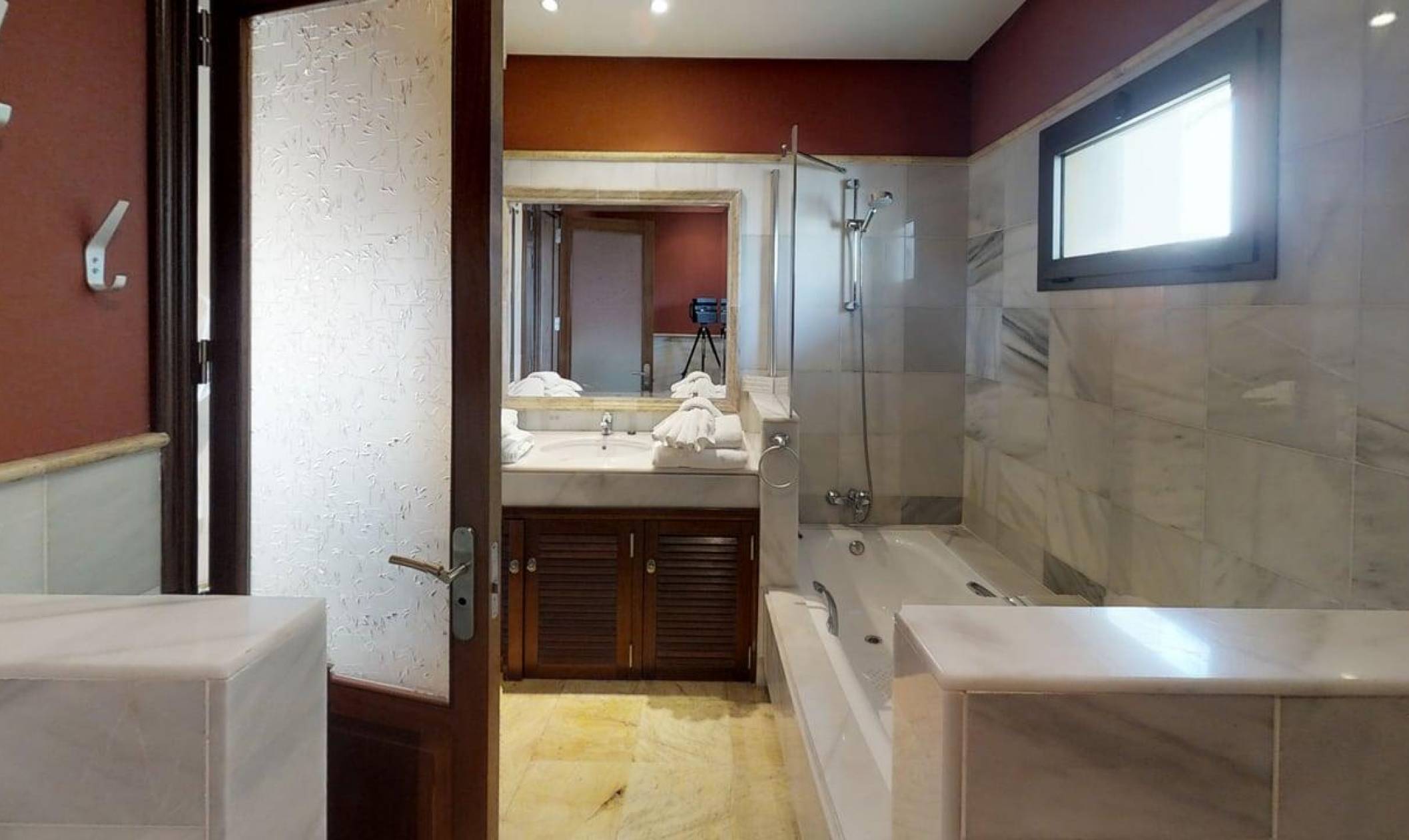 air-conditioning/heating, 100% cotton Ralph Lauren designer linen, DVD/TV, & has lots of wardrobe space and plenty of hangers and 2 hairdryers, have their respective bathrooms/wc's opposite; all overlook the pool and sun terrace.