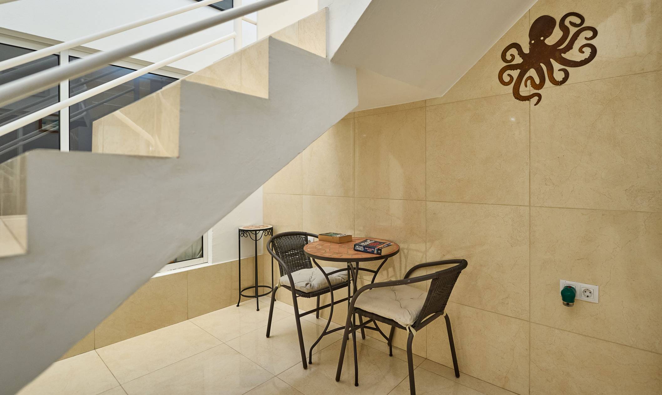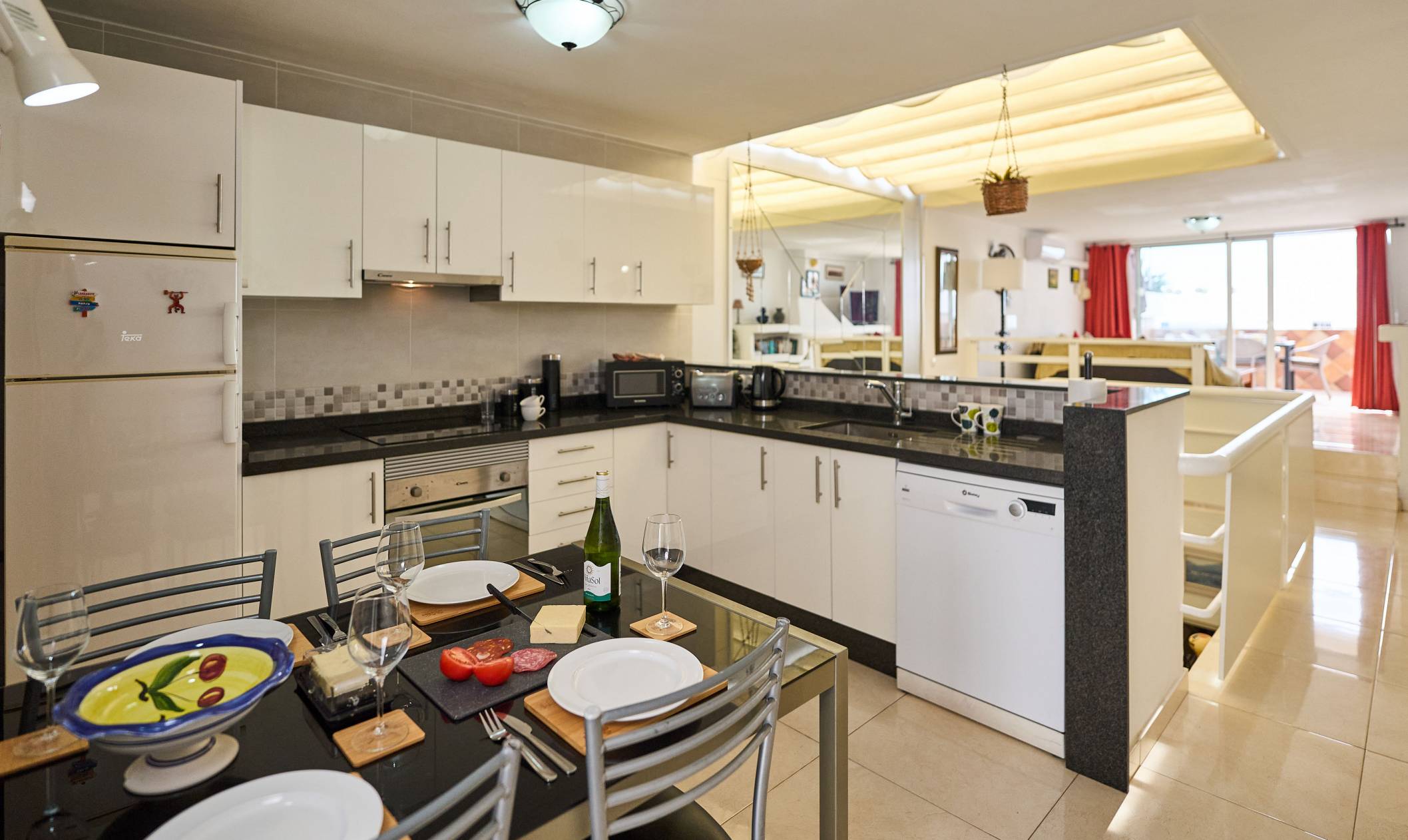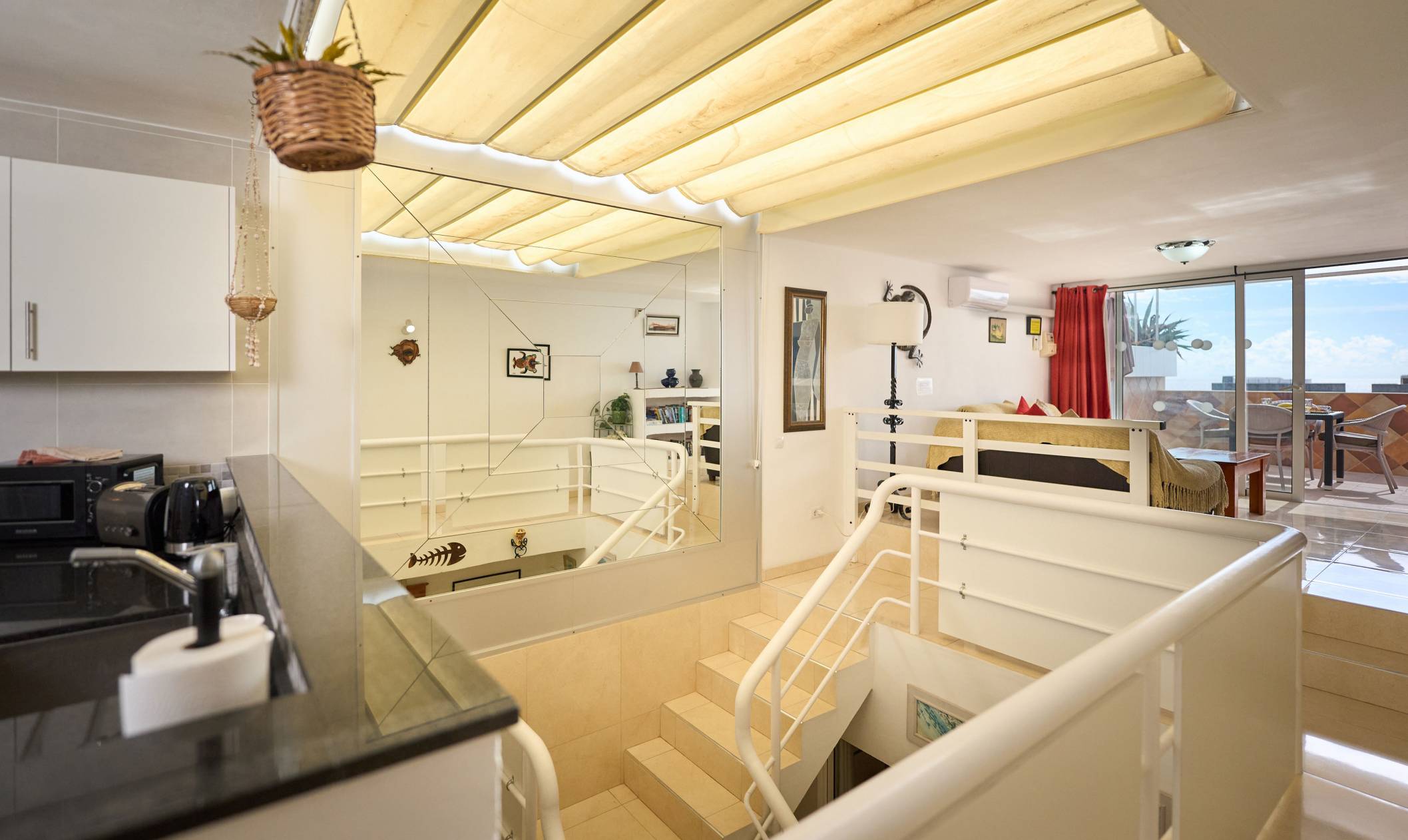 Interior: This two storey, duplex apartment is extremely light and spacious. On the upper floor there is a very well equipped, open plan kitchen and dining area. The raised living room is comfortably furnished and leads out to the terrace via large patio doors. There is also a cloakroom and utility room on this level. An open plan staircase with mirrored wall and steel rails leads down to the bedrooms. A partial glass ceiling and internal area add to the light, spacious feeling. The extremely generous bedrooms are both en-suite and have ample wardrobe space. The master bedroom has a double bed and an en-suite bathroom with a overhead shower, and a single basin. the second bedroom has twin beds and an en-suite bathroom.