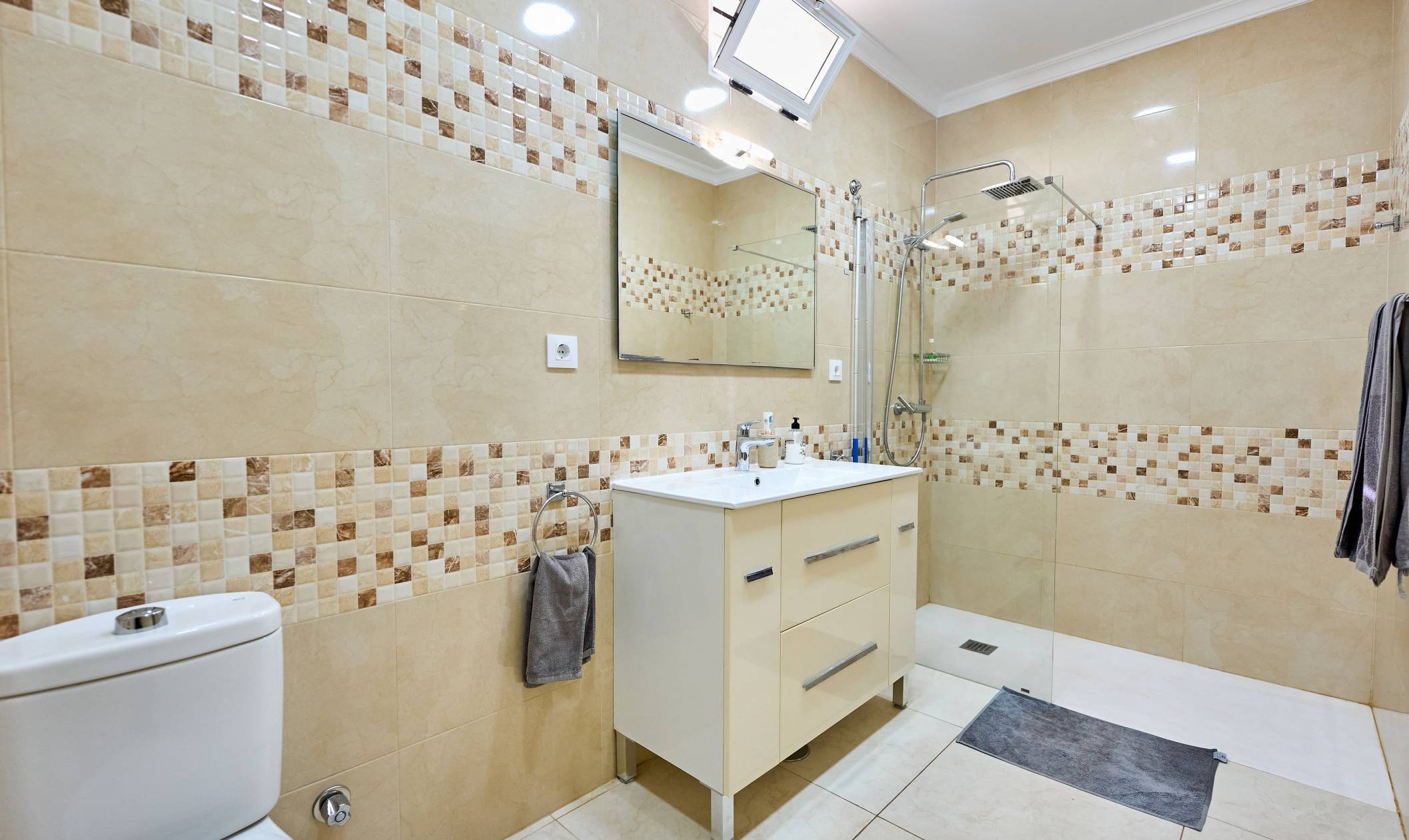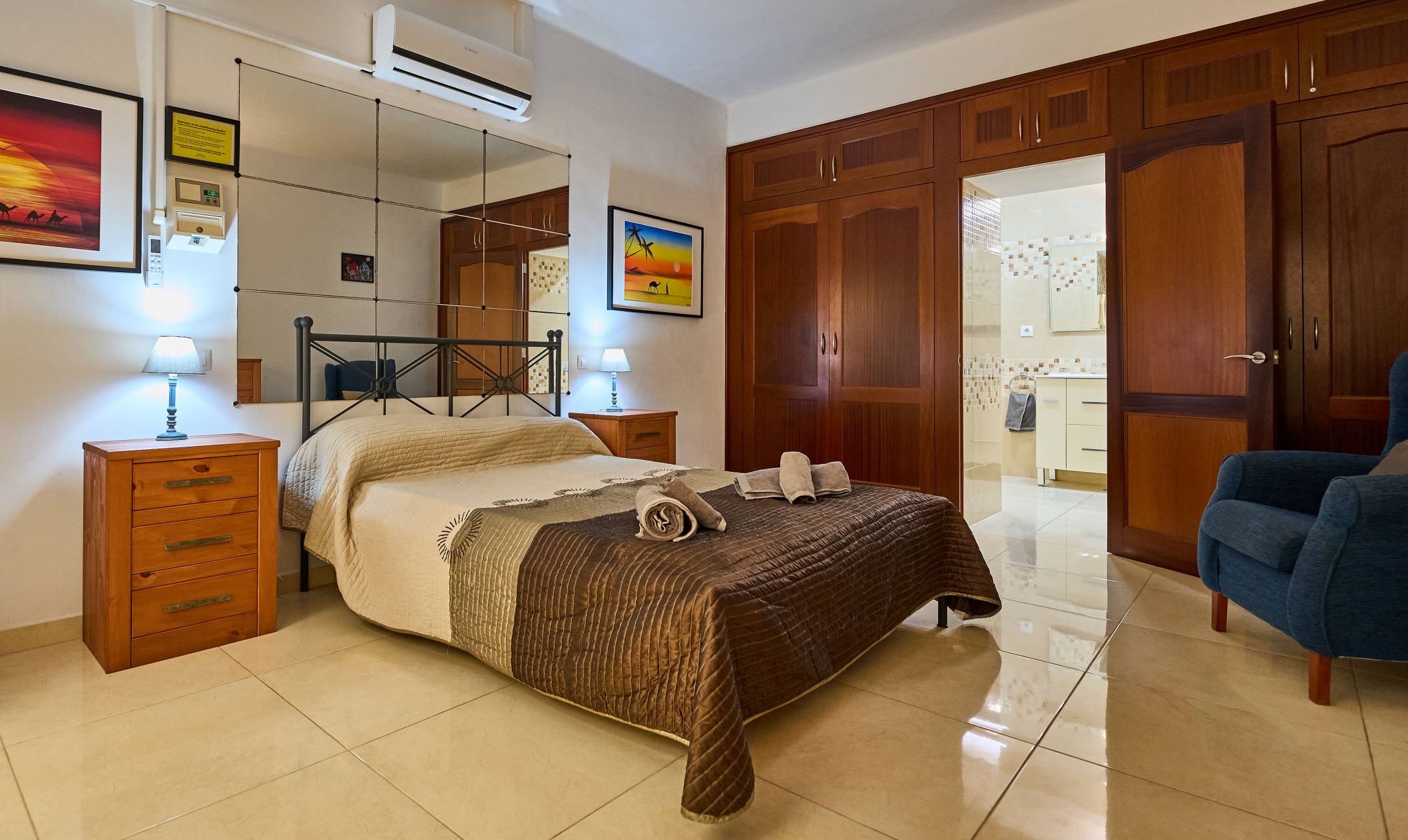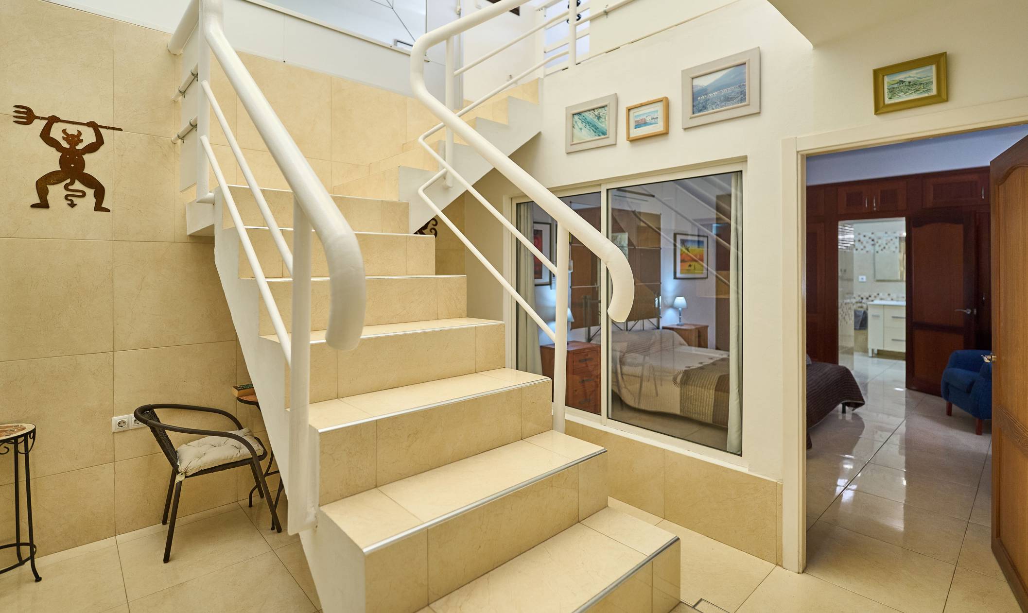 Interior: This two storey, duplex apartment is extremely light and spacious. On the upper floor there is a very well equipped, open plan kitchen and dining area. The raised living room is comfortably furnished and leads out to the terrace via large patio doors. There is also a cloakroom and utility room on this level. An open plan staircase with mirrored wall and steel rails leads down to the bedrooms. A partial glass ceiling and internal area add to the light, spacious feeling. The extremely generous bedrooms are both en-suite and have ample wardrobe space. The master bedroom has a double bed and an en-suite bathroom with a overhead shower, and a single basin. the second bedroom has twin beds and an en-suite bathroom.